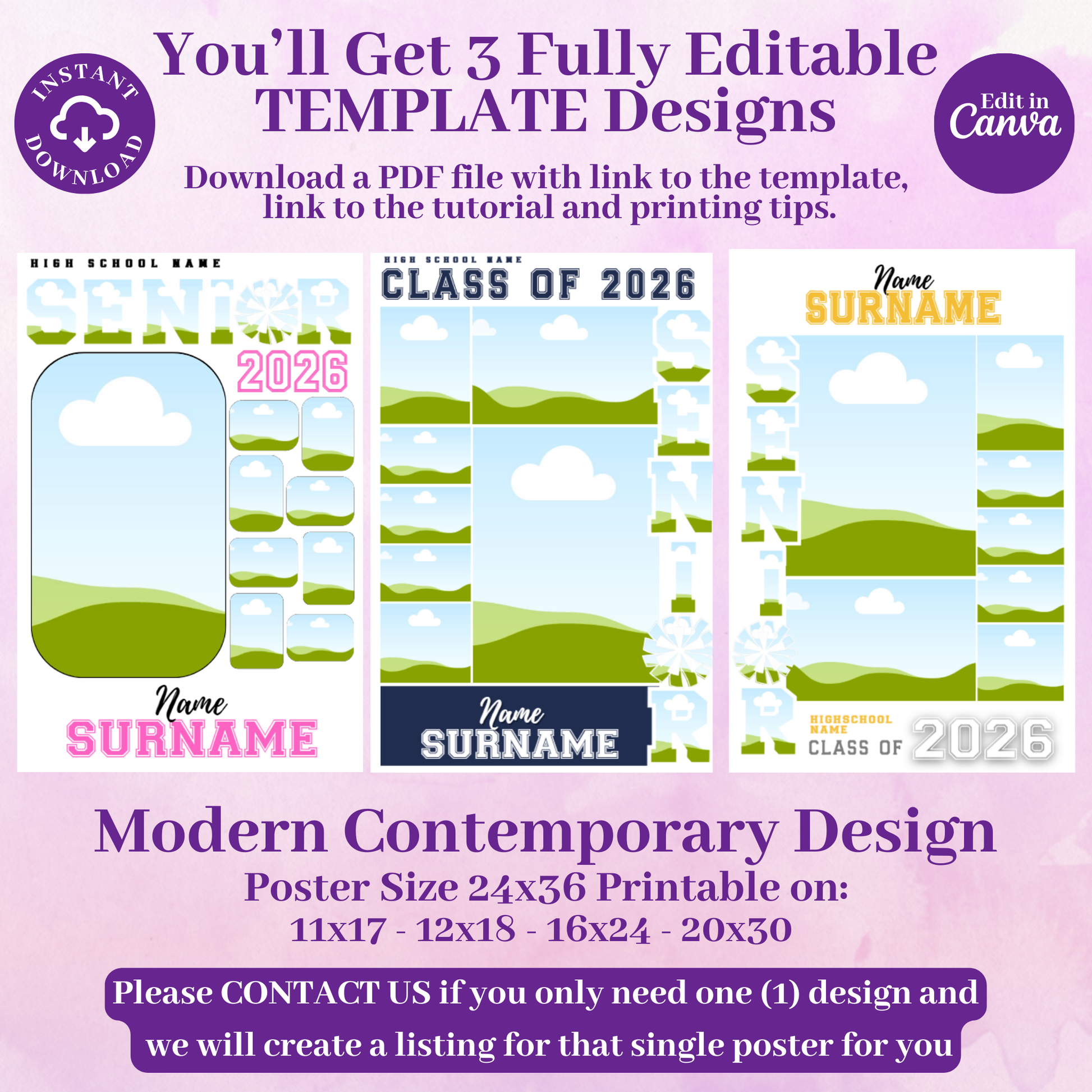 After purchase, you'll receive instant access to downloadable design templates. Customize with your athlete's name, photos, jersey number, stats, and team colors. Print at home or through a professional printer.