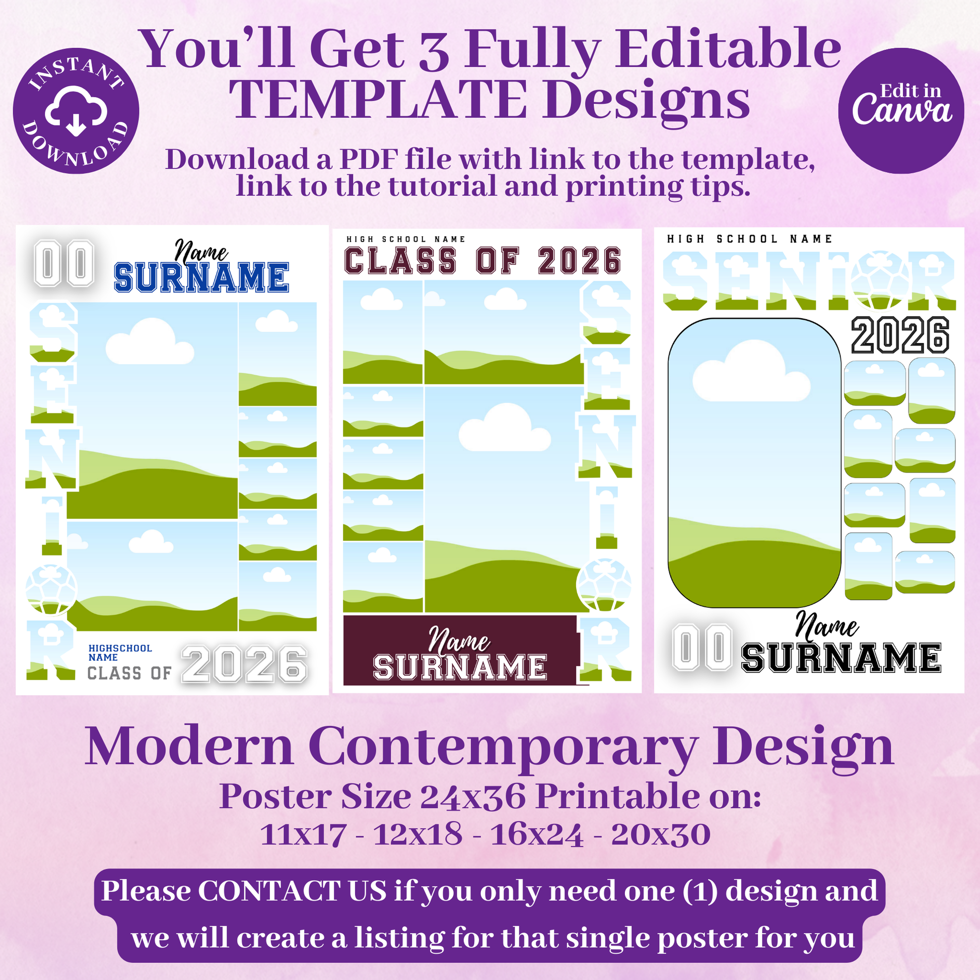 This Senior soccer poster template is perfect for families who want full creative control. You will receive three different editable designs that allow you to upload photos, edit text, adjust colors, and export for print using a free Canva account.