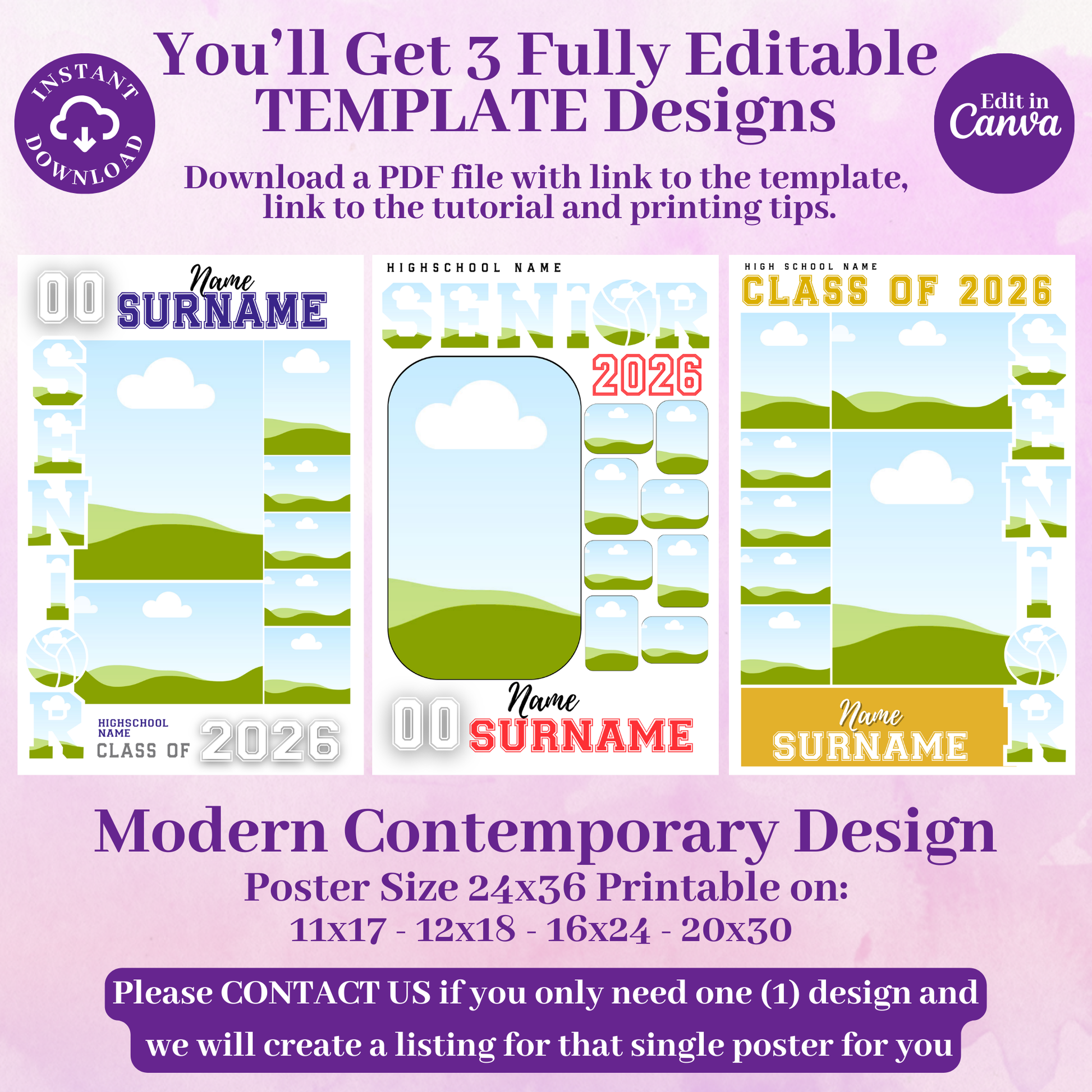 When you purchase this digital poster, you'll receive 3 editable templates to customize for your senior night volleyball celebration.